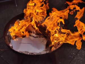 Passend zur Ablehnung aller Beweisanträge am Vortag wurden dann während und nach der Verhandlung am nächsten Tag die unter Beweis gestellten Tatsachen symbolisch verbrannt – interessiert sich das Gericht doch einen Dreck dafür. Die Versammlungsbehörde in Mönchengladbach hatte dafür genau festgelegt, wer (erst ab 18) wie was mit welchem Werkzeug (nur Feuerzeug erlaubt) anzünden dürfe und welche Sicherheitsmaßnahmen es brauche, um ein paar Blätter Papier zu verbrennen. Polizei und Jusitzwachtmeister*innen passten eifrig auf.